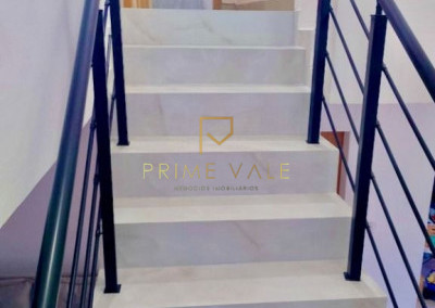 Escada revestida em porcelanato com janela de vidro ampla – iluminação natural de sobra!